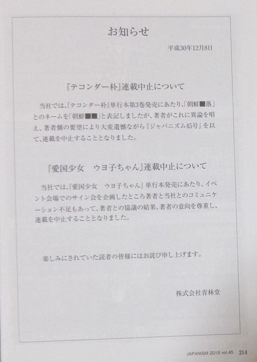 「ジャパニズム」(青林堂)で連載の「テコンダー朴」は、複数の諸般の事情により著者と青林堂との間の信頼関係が失われたため、青林堂で執筆を続けることが困難になったので、著者の意向で連載を終了することになりました。読者の皆様にはこれまでのご愛読を感謝いたします。(白正男、山戸大輔)