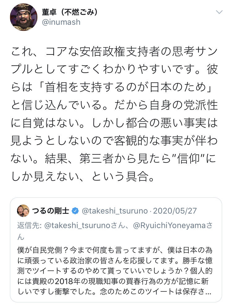 - つるのが普段何言ってるかしらんけど首相頑張れって言ったら安倍政権支持って言え!ってなるのはなんなん