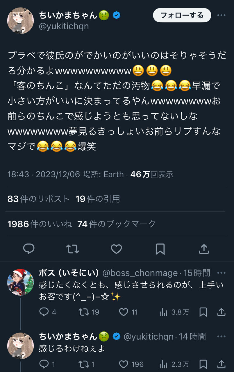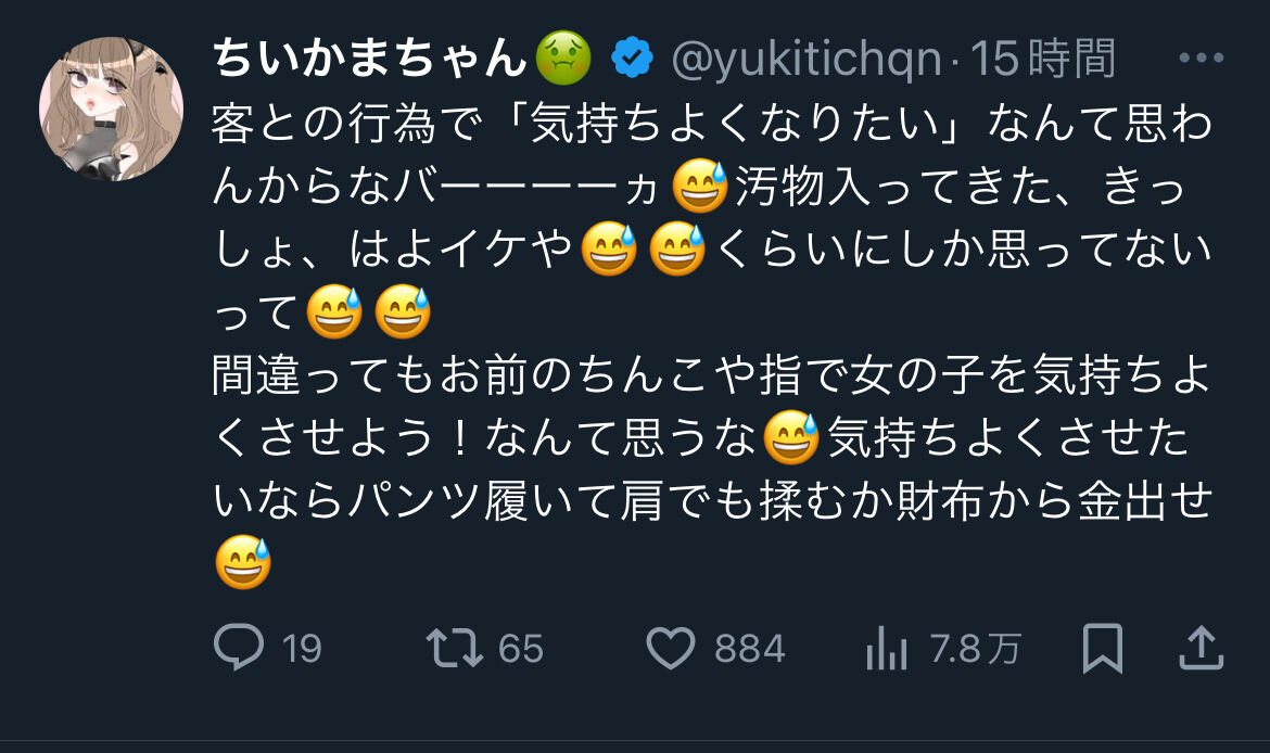 - 気持ちよくさせたいならパンツ履いて肩でも揉むか財布から金出せ😅