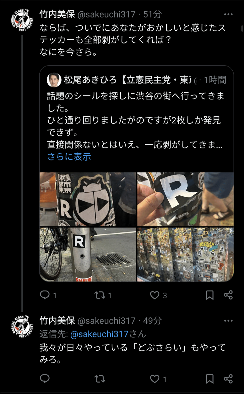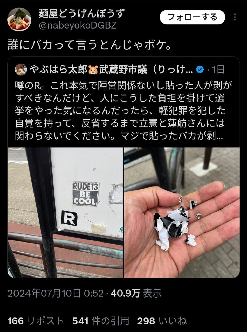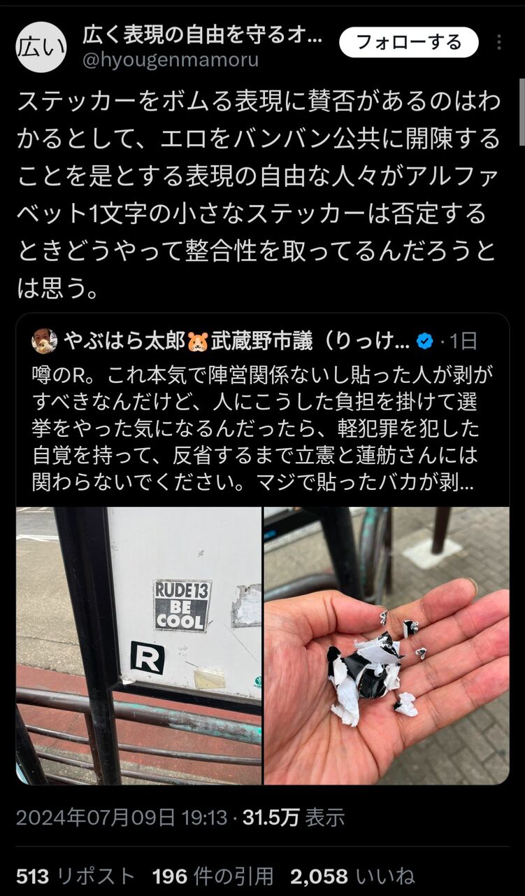 - 蓮舫支持者「Rシールは表現の自由だろ!ネトウヨはお前らの大好きな表現の自由を守れ」