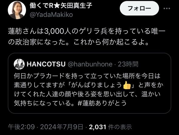 引用元: ・蓮舫支持者「蓮舫さんは3000人のゲリラ兵を持っている。これから何か起こるよ」