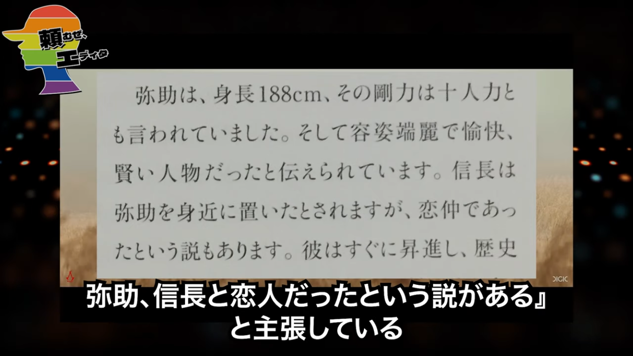 - 弥助「泣きました 僕はユダヤ系イギリス人に5ヶ国語を操り織田信長と恋仲だった伝説の侍にでっち上げられ ハリウッドで映画化予定の フランスとカナダに日本人をぶち殺すゲームの主人公にされ 菅内閣の成長戦略会議議員にシルクロードを踏破したことにされた イエズス会が連れてきた黒人奴隷です」