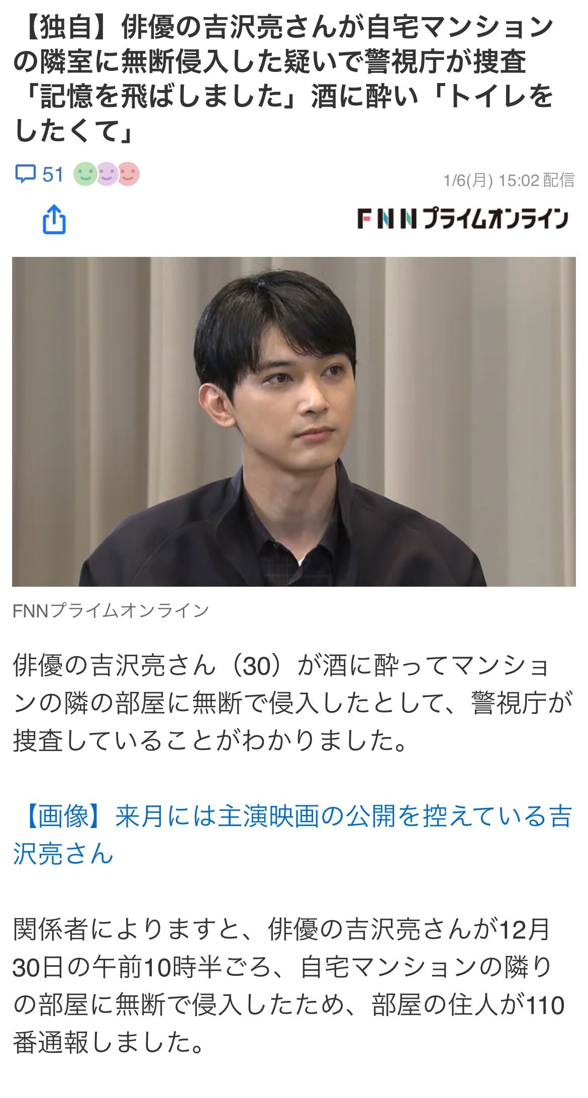 引用元: ・【悲報】吉沢亮、自宅マンションの隣室に無断侵入した疑いで警視庁が捜査