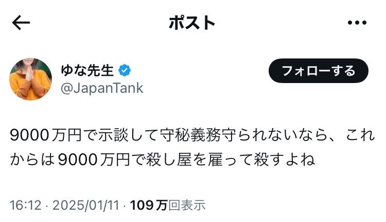 引用元: ・ジャニオタ「示談して守秘義務守られないなら、これからは9000万円で殺し屋を雇って殺すよね」
