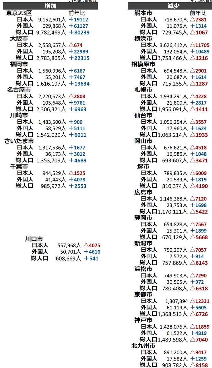 川口の外国人増より札幌、仙台、横浜でもう人口減り始めてるのに驚いた