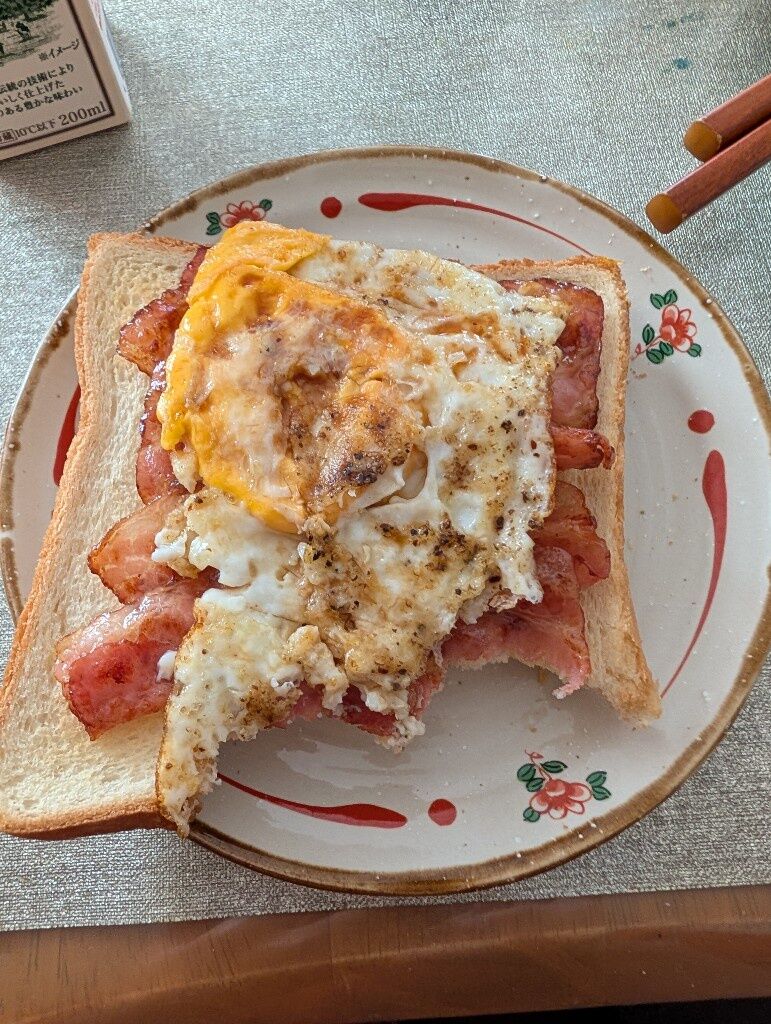 - カリっカリに焼いた食パンの上に塩気の効いたベーコンと味を包みこむ目玉焼き。