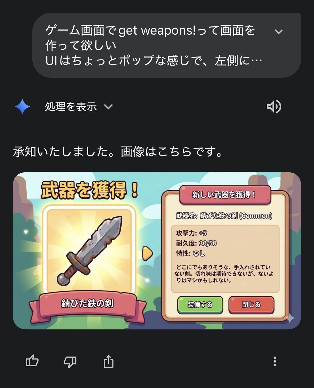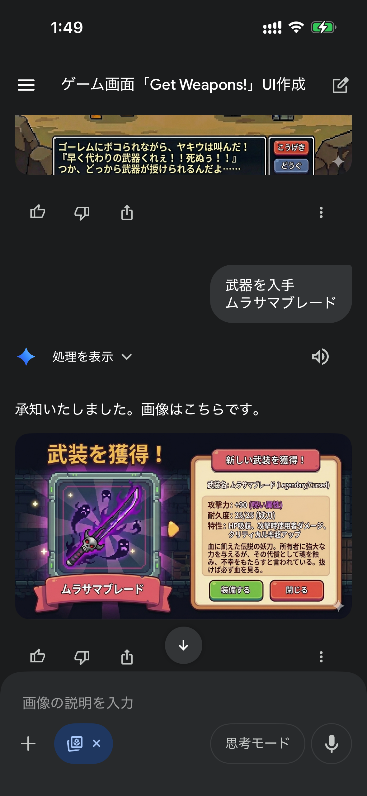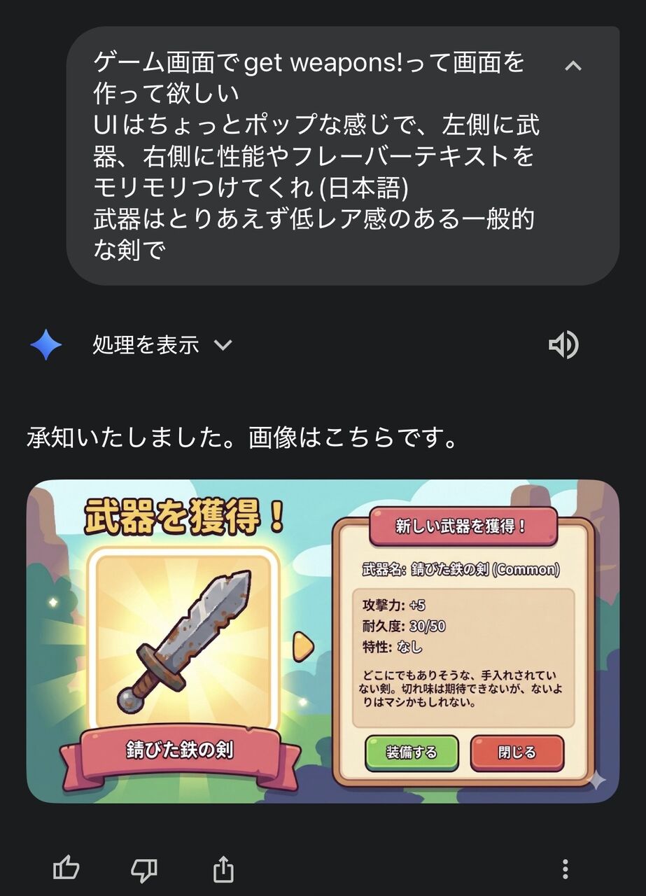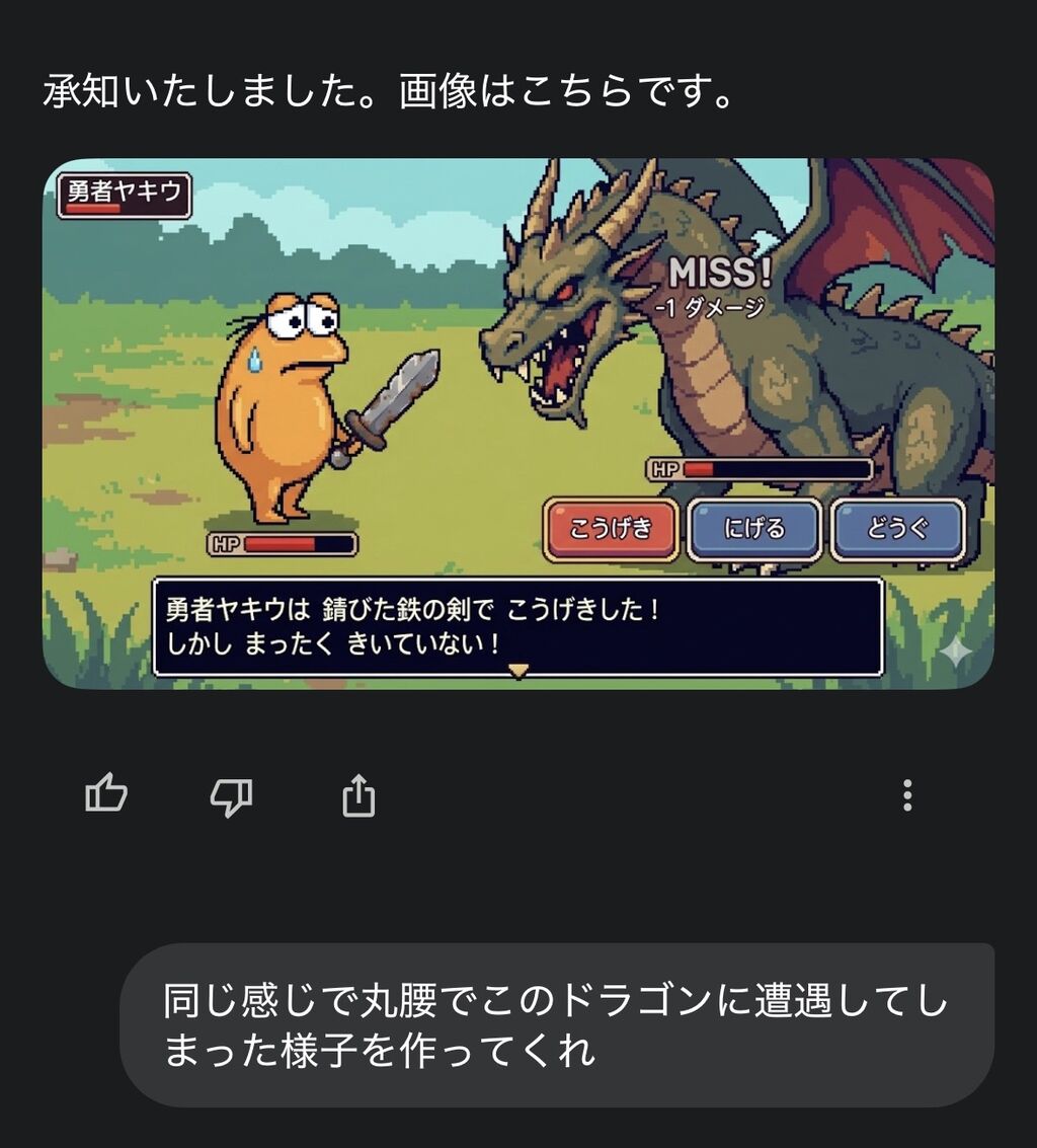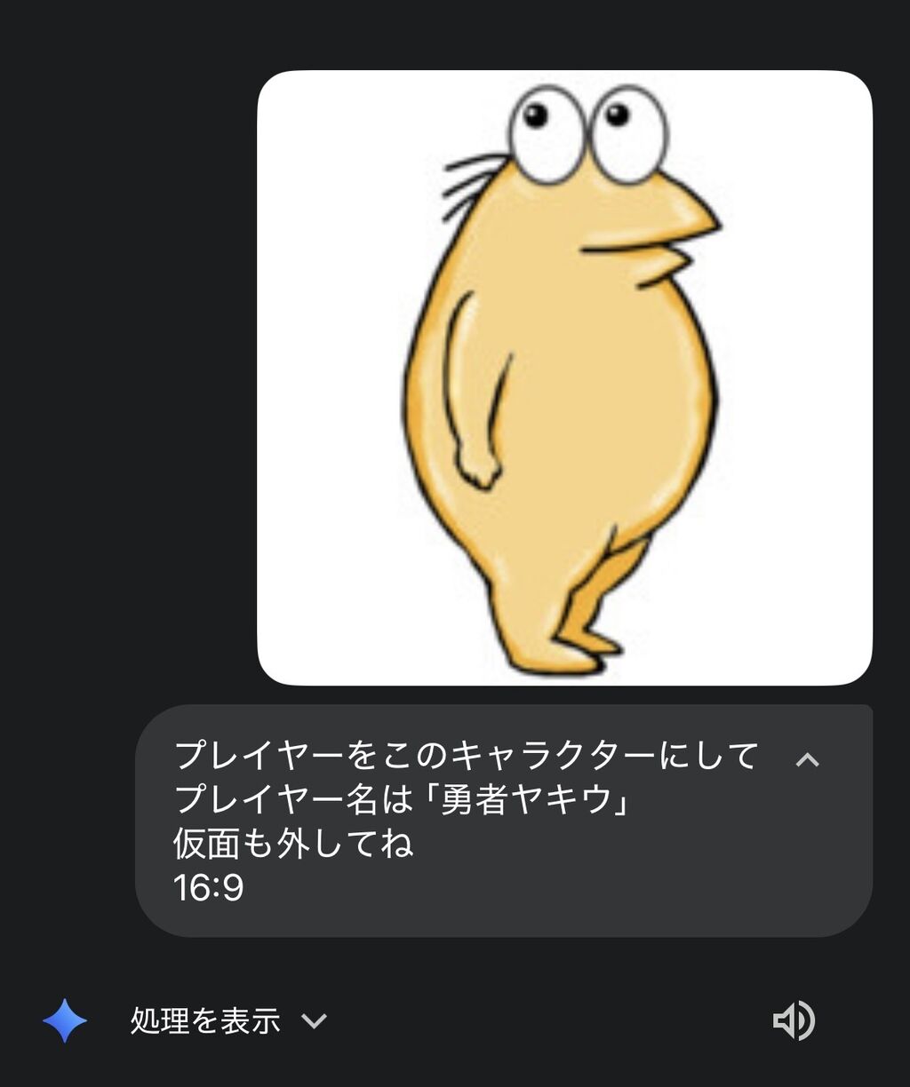 - Geminiがもうキツイって言ってる(画像生成が一世代前の微妙なやつになる)のでここでセーブするわ