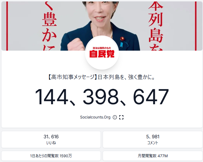 引用元: ・【画像】高市早苗、1.4億再生突破 日本国内ではHIKAKIN、アンパンマンに並ぶ
