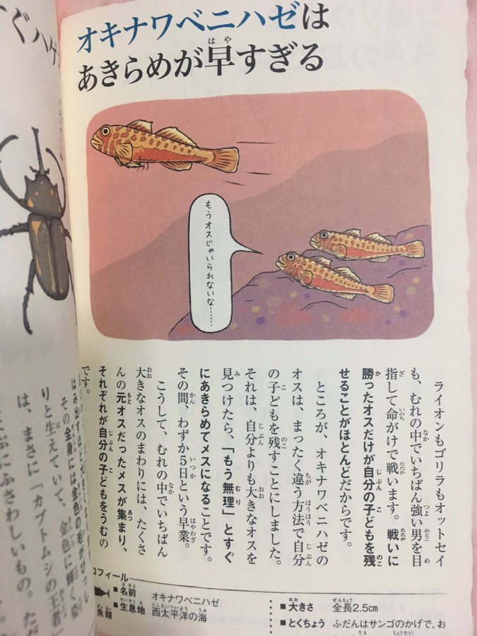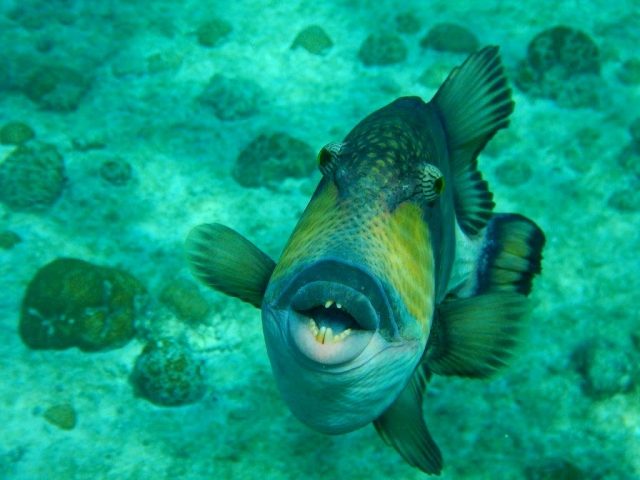 見かけに反してその気質は獰猛そのもので、ダイバーを見かけては貝をも容易に噛み砕くその顎で襲いかかってくるという